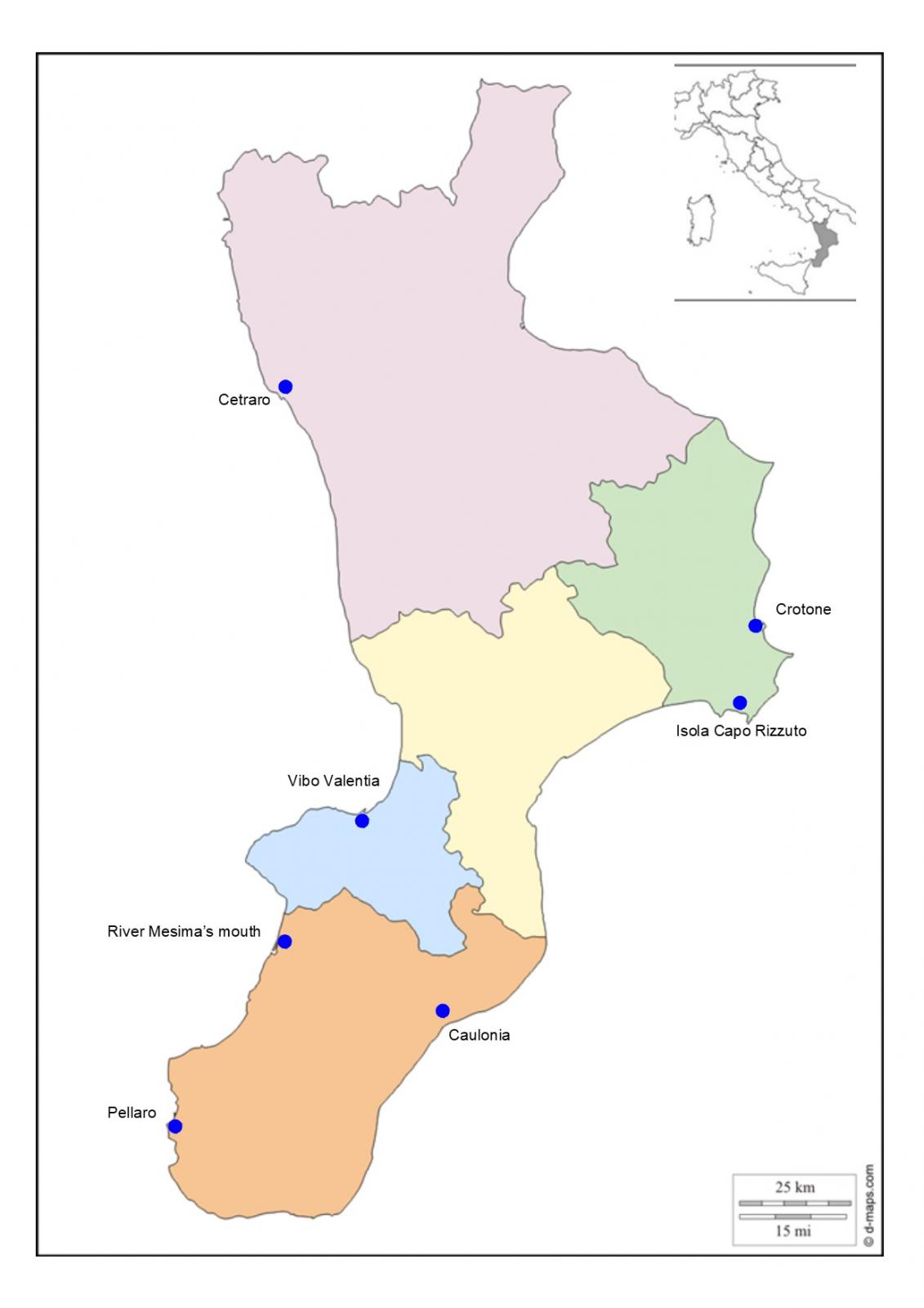 Figure 2. Study areas along the coastline of Calabria, Italy