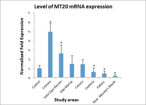 Regarding the gene isoform MT20, the highest levels of expression were found in the study areas: Crotone (4.92 Normalized Fold Expression) and Isola Capo Rizzuto (2.59 Normalized Fold Expression).