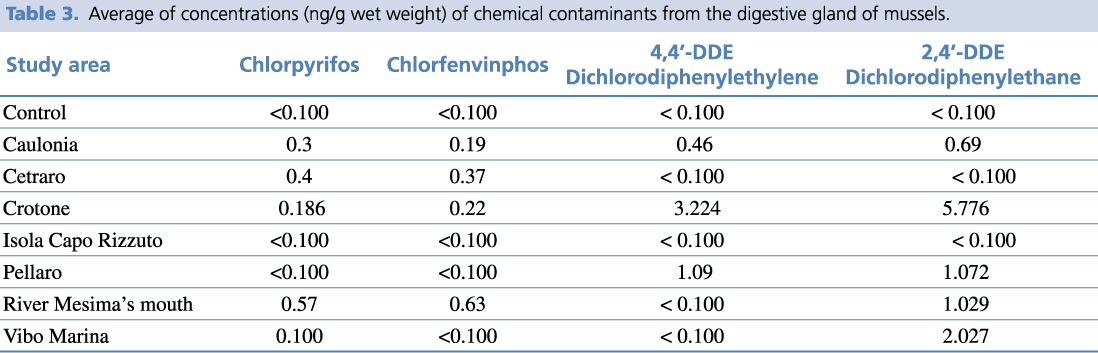 Regarding the analyzed organic compounds, the highest concentration of Chlorpyrifos and Chlorfenvinphos (banned by the European Union since 2003) compounds were detected at the river Mesima’s mouth station. Meanwhile the concentration of 4,4'-Dichlorodiphenylethylene (4,4'DDE) was below the threshold value and the concentration of 2,4'-Dichlorodiphenylethane (2,4'DDE) was significantly above this value. In regards to Pellaro, while the concentrations of Chlorpyrifos and Chlorfenvinphos was below the threshold value, the concentrations of 4,4’-DDE and 2,4’-DDE was significantly above this value. Crotone showed the concentrations of Chlorpyrifos and Chlorfenvinphos significantly above the threshold value, and the highest concentration of 4,4’-DDE and 2,4’-DDE. In Caulonia the concentrations of both organophosphate and organochlorinated compounds were significantly higher than control. Instead, in Isola Capo Rizzuto the levels of all four compounds were below the threshold value. Lastly, Cetraro showed the concentrations of organophosphate compounds significantly higher than control, while the concentration of organochlorinated compounds were below the threshold value. (Table 3).