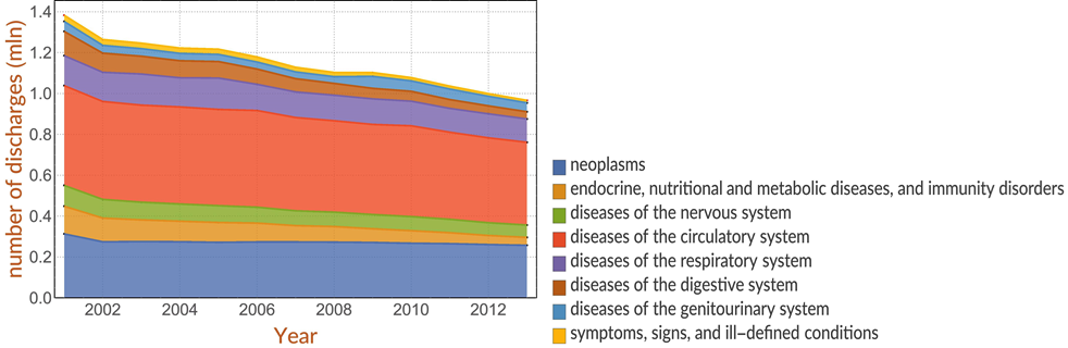 In the case of multiple hospitalizations for the same disease (i.e. the same main diagnosis at discharge) only the diagnosis made at the first hospitalization has been considered. As shown in Figure 1, this criterion translates into a lower number of hospital discharges and in a somewhat different temporal trend of hospitalizations.