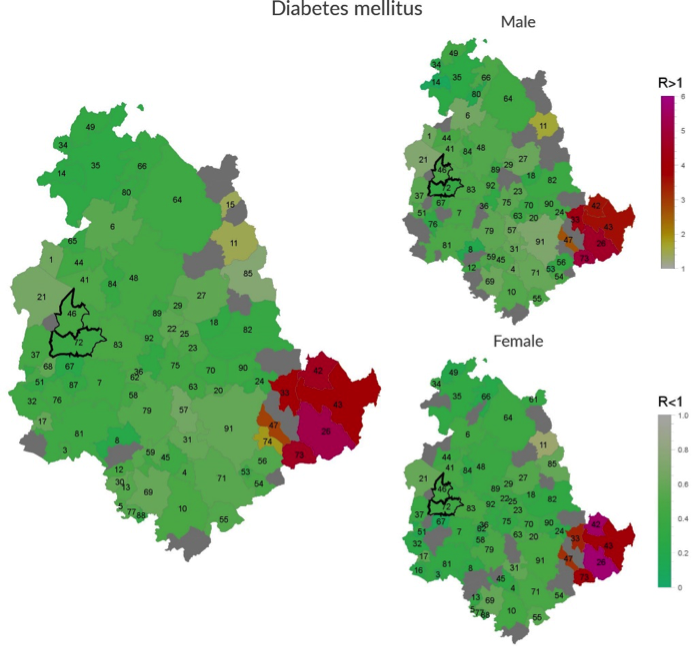 For the overwhelming majority of the diseases, there was no significant difference in excess or defect. Overall, these data suggest the absence of local factors impacting on the health status of residents.