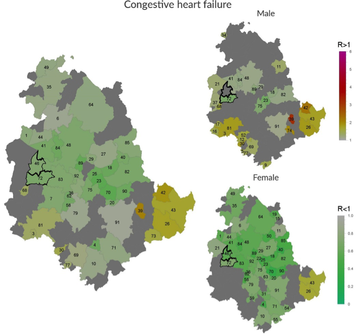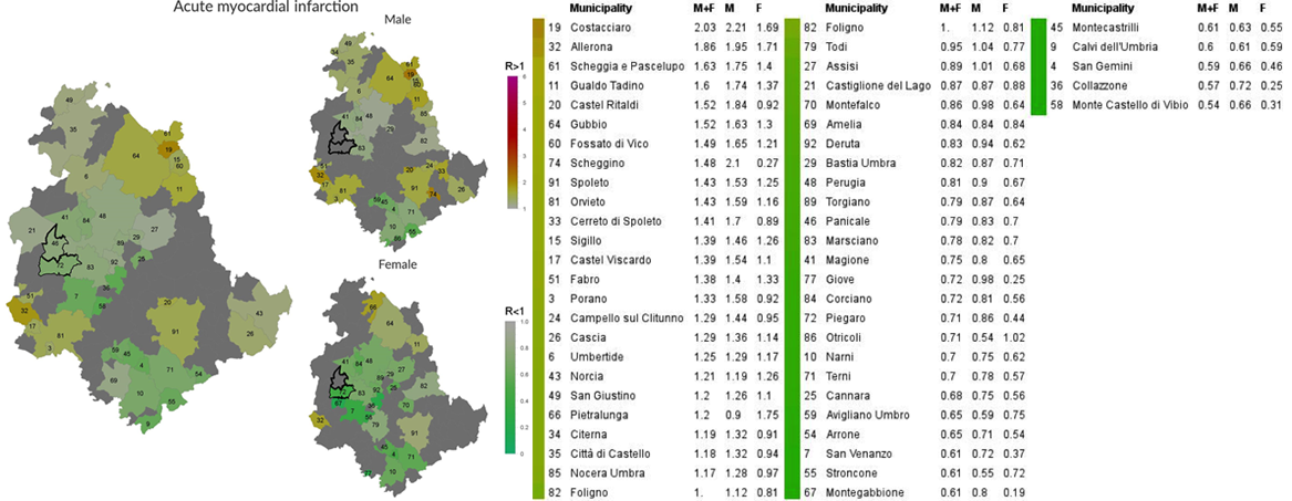 The only disorders involving both sexes in both towns regarded significant defects in the incidence of diabetes and of heart failure. Interestingly, the decreased incidence of diabetes regarded almost the whole Umbria Region. Since the rate of hospitalization for diabetes is inversely related to the efficiency of ambulatory services for this disease, it would be interesting to have data about the incidence of this disease in the Umbria Region, for a correct interpretation of this finding.