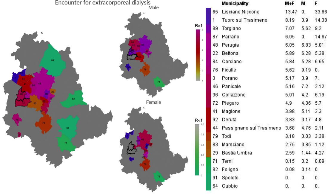In detail, among the diseases in excess none showed a significantly higher incidence in both sexes and in both towns. In the case of “Chronic intermittent dyalitic treatment”, an excess was detected in both towns but only considering together the male and the female population. This finding may be of some interest, since, as shown in the maps, a similar situation was present in the neighbouring towns. On the other hand, the absence of any excess in the incidence of chronic renal failure (which was indeed in defect in the female sex population of Panicale) makes troubling the interpretation of these data, since chronic renal failure should be tightly associated to the dyalitic treatment. It might be hypothesized that the observed excess in the incidence of the dyalitic treatment might be the reflection of the action of an agent inducing chronic renal failure in the past, but no more active currently.