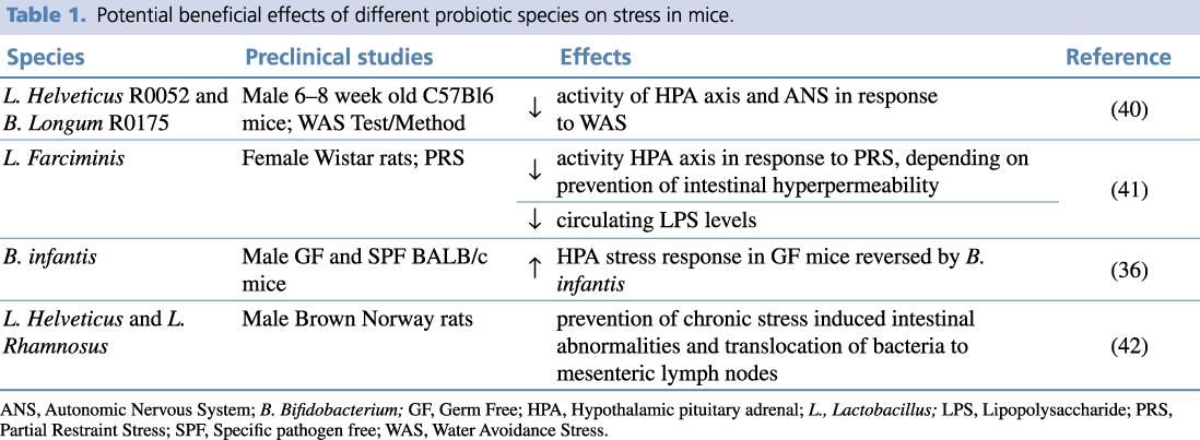 Table 1. Potential beneficial effects of different probiotic species on stress in mice.