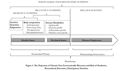 The chronic non-communicable diseases (CNCDs), including obesity, cardiovascular disease, diabetes, chronic kidney disease, osteoporosis, sarcopenia, Alzheimer's disease, chronic obstructive pulmonary disease (COPD) and cancer, have had a rapid increase in the last decade, spreading globally as an epidemic infectious.According to projections, there will be a further increase of 15% globally between 2010 and 2020, causing 44 million deaths for CNCDs.1 Therefore, it is required a turnaround, providing new preventive strategies2 and targeted interventions for the general and at high diseases risk population.1 To this end, it is necessary to utilize new tools and predictive biomarkers for identifying the risk factors that contribute to the onset of CNCDs, grouping them based on metabolic factors, body composition and genetic profiles.3
