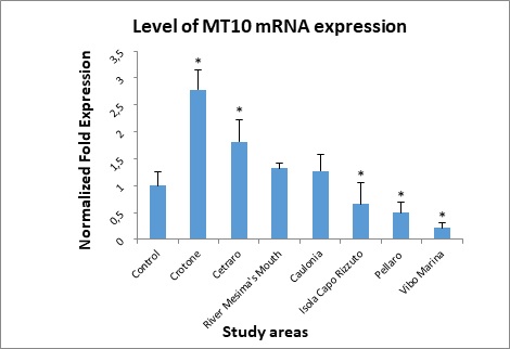 The highest level of MT10 gene expression, as shown in the Crotone area, agrees with the highest concentration of zinc found by chemical analysis (145.02 μg/g) and could be ascribed to chemical contamination due to industrial activity which operated for over 50 years in the Crotone area.