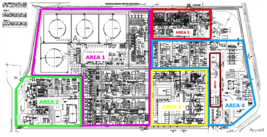 The diagram below (Figure 1) shows the different areas of the Oil and Gas plant, which are subdivided based on operational activities. Since each of the areas poses different potential occupational hazards, the sampling plan took this into account. As the sampling plan was created and implemented, the team worked to sample the different areas of the plant in an effort to capture differences in exposure levels.