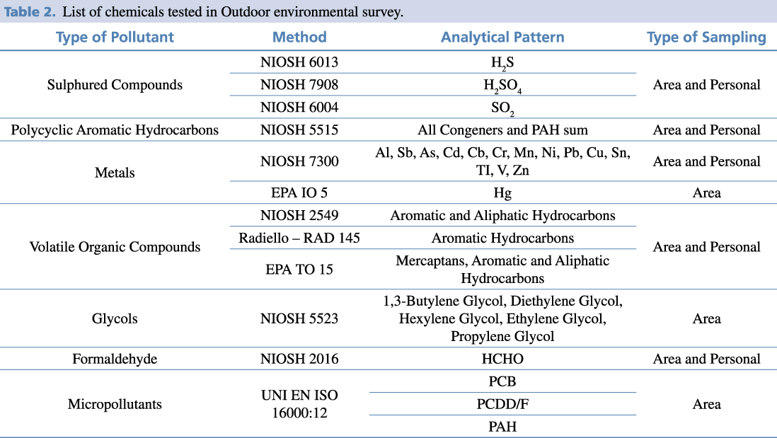 Currently, there are initial results available for the sampling completed by the Italian Industrial Hygiene Company at the Oil and Gas plant for three separate studies. The first study was conducted in February of 2016 and involved area sampling for 53 chemicals.1 In total, 23,000 sample data points were collected during the 30-day sampling period. Table 1 presents the type of pollutants sampled in addition to the methods used. The second study was completed between December 2016 and March 2017 and included both area and personal sampling.2 Overall, 131 chemicals were monitored and 27,327 samples were collected. Table 2 presents the type of pollutants sampled along with the methods used.3 In the third study, 143 chemicals were sampled in early 2018. The chemicals were categorized into the following groups: aromatic hydrocarbons, sulfur compounds, other VOCs, odorants, metals, glycols, alcohols, powders, CFC, other VICs, amines, IPA, PCBs, and PCDD/F. The third study was a continuation of the initial two studies and was designed to expand on the chemicals tested previously. The third study encompassed a greater diversity of plant areas and sampling times that more closely tied with integrals of personnel shifts at the plant.4