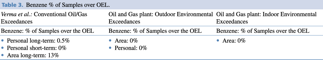 We also conducted a literature review to identify additional publications on exposure levels for employees working at upstream petroleum plants. There were a few studies that focused on various health outcomes associated with occupational exposures, but we did not find a large number of studies that reported exposure levels. There was one comprehensive study by Verma et al. from 2000 titled Benzene and Total Hydrocarbon Exposure in the Upstream Petroleum Oil and Gas Industry, and we will use this study and their findings as a benchmark and guide to analyse the Oil and Gas center sampling results. Verma et al. focused on benzene and hydrocarbons, reporting maximum values for these chemicals and the percentages of their samples that exceeded occupational exposure limits.7