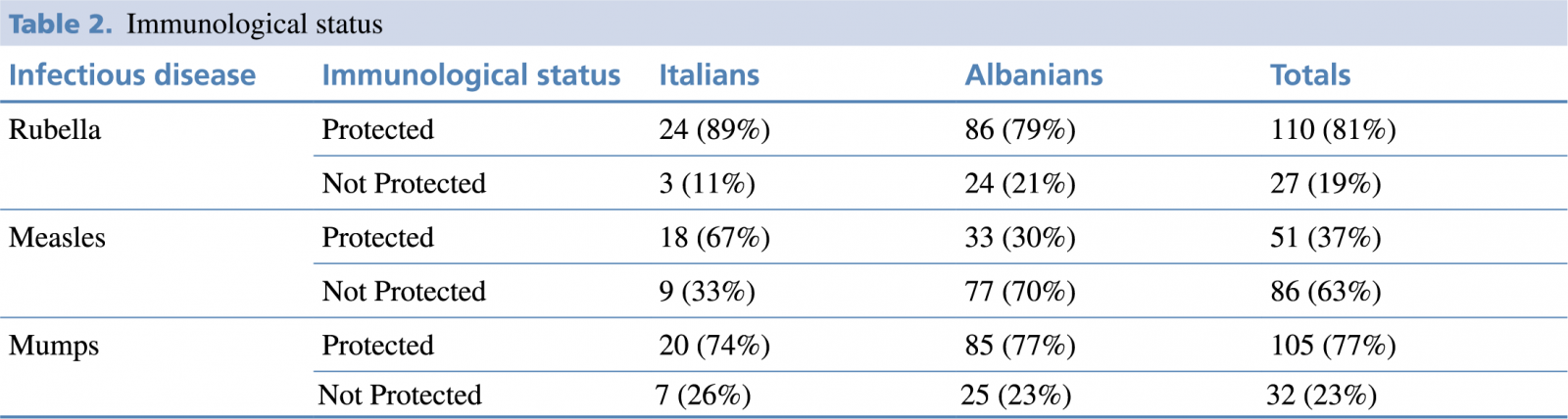 The sample was stratified by nationality to understand the differences between the two nationality groups, based on a different vaccination policy between Italy and Albania. The analysis showed that in the Italian group 24 students out of a total of 27 (89%) were protected against Rubella, while in Albanian group 87 students out of a total of 111 (78%). Therefore, the number of Albanian individuals unprotected for rubella among Albanians was quite high (21%; n.23 individuals). For mumps, the data indicates that the percentage of students with a protective antibody level was almost the same in both the two groups, 74% and 77% respectively. Protection against measles was not satisfactory among the two groups: the protective antibody titer among Albanians was only 29%, which means that the 71% was not immunized. As for Italian students, immunization reached 67%, while 33% resulted unprotected: a significant difference emerged between the two nationality groups (p<0.01).
